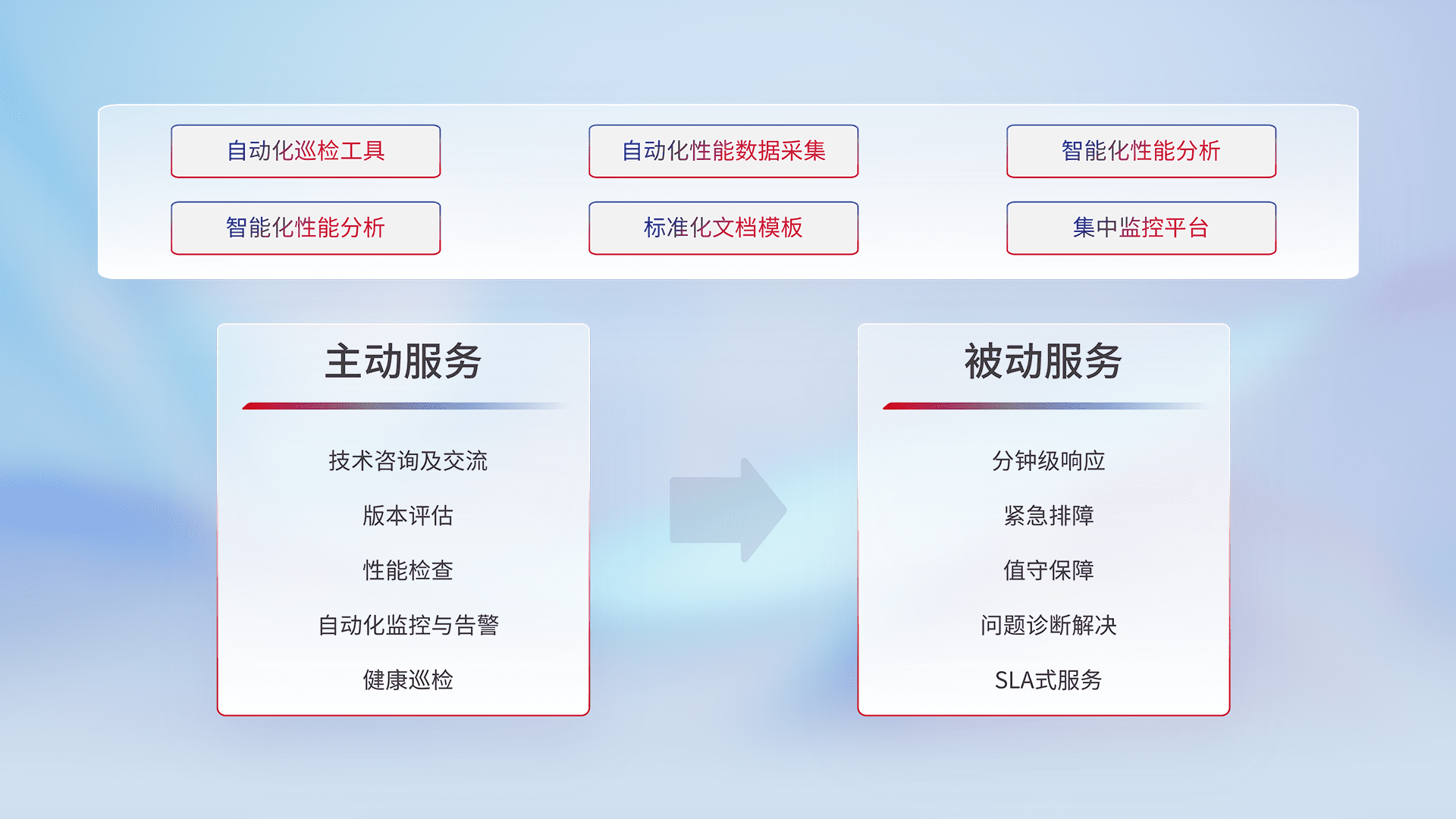 智能化工具和标准化文档,,,,保障服务质量,,,,提供主动服务(包含技术咨询、、、、版本评估、、、性能检查、、自动化监控与告警、、健康巡检)和被动服务包含(分钟级响应、、、、紧急排障、、、、值守保障、、、、问题诊断解决、、、SLA服务)。。。